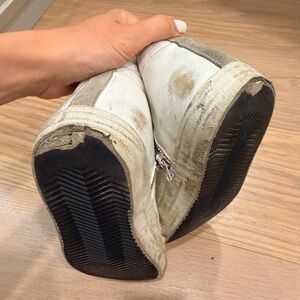 Stylish high-top sneakers. White leather with gray suede accents. Signature Golden Goose design.