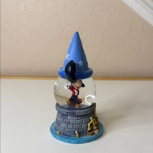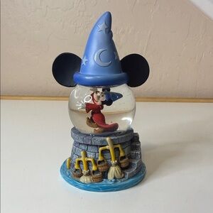 Charming Disney sculpture featuring Sorcerer Mickey. Blue hat with stars and moon. Black ears. Detailed base with water and barrels.
