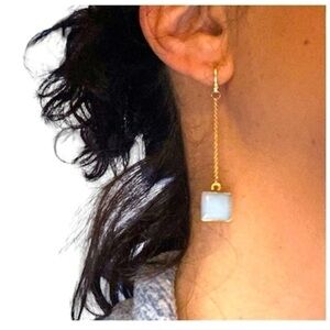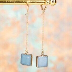 Featuring dainty gold hoops with delicate chain drops and light blue square stone pendants, these earrings add a modern minimalist touch to both casual and dressy outfits.