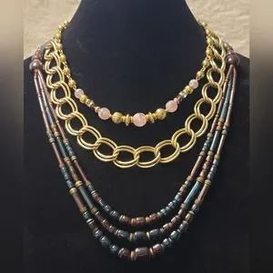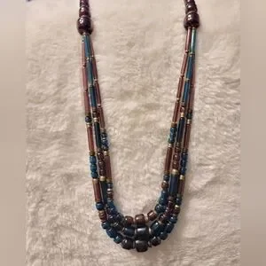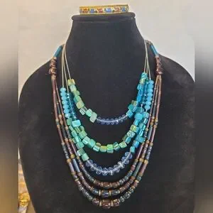 All Glass Very Vintage Aegean Blue & Wine Colored Necklace With Brass Elements.