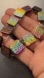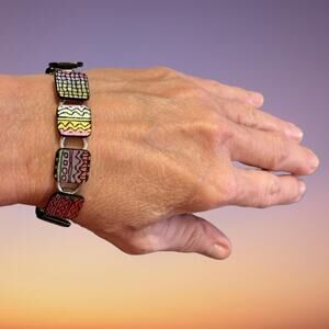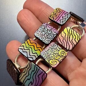 This is a gorgeous rainbow metallic artisan glass silver tone link bracelet measuring 8" in length. Each glass bead is different, sporting a geometric design and measuring .5" x .5". It's in excellent preloved condition.