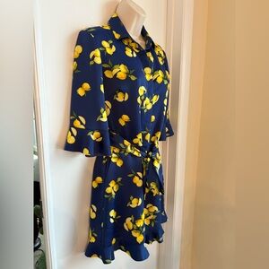 Stylish navy shorts romper with vibrant and fun lemon pattern. Features a tie waist and flared sleeves. Perfect for the summer or a warm vacation!