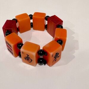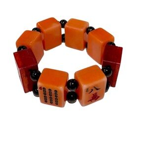 Bracelet features 8 smaller size Mahjongg tiles making this an easy to wear bracelet. 8 tiles in coral and a reddish color with two black beads between each tile. Color is gorgeous and rare.