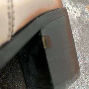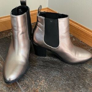 Madden Girl Barbiee pewter silver pull on ankle boot with block heel. Size 6.5. Pull on bootie with stretch elastic gores on either side, pointer toe and block heel. Pre owned. A couple marks, scrapes and a piece of black cover on heel is lifted. Adhesive should fix, doesn’t affect function. See photos for flaws. Casual