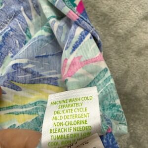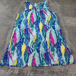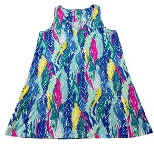 Embrace vibrant island vibes with this Lilly Pulitzer shift dress. A playful feather print in shades of blue pink green and yellow adorns this sleeveless V-neck style. The comfortable knit fabric and flattering A-line silhouette make it perfect for a sunny day out or a casual beachside brunch.