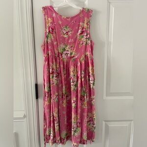 Delightful pink April Cornell dress with vibrant floral patterns. Sleeveless design for easy wear. Perfect for casual outings. 100% cotton. Brand new with tags