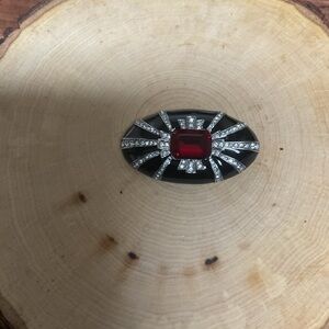 Stunning black brooch with silver accents and red center stone with crystal Swarovski, perfect for adding elegance to any outfit. Pre-owned, great condition, Reasonable offers accept!