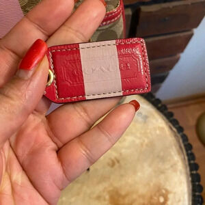 Such a cute crossbody in Coach beige monogram canvas and pink leather. Hang tag on this bag is so pretty