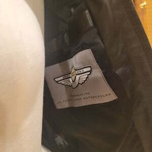 HARLEY-DAVIDSON BRAND. Bold Harley-Davidson branding on back. Sleek black leather with gold accents. Timeless bomber style. Two exterior zip pockets, & one interior pocket. Some pilling on lining as noted. A MUST HAVE FOR YOUR RIDING DAYS.