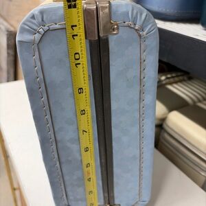Charming vintage style suitcase in blue and cream. Features a playful design perfect for adding a touch of retro flair to your outfit.