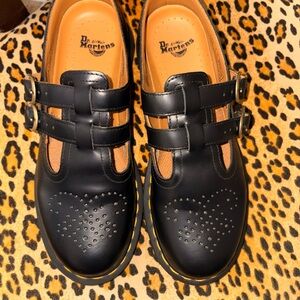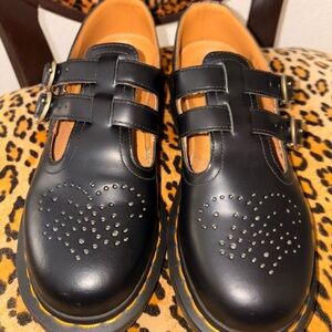 Classic black Mary Janes with perforated detailing. Features double strap design. Iconic Dr. Martens style.