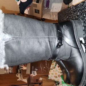 Cozy black and gray boots with soft fur trim. Ideal for winter weather. Durable and stylish design.