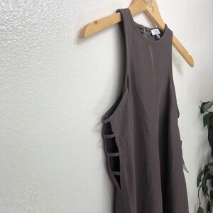 A beautiful brown, almost like military green, dress with cutouts on the top and bottom of each side. High neck. little to no stretch to the dress.