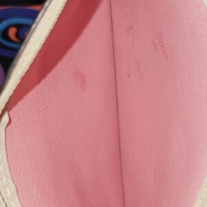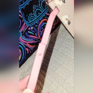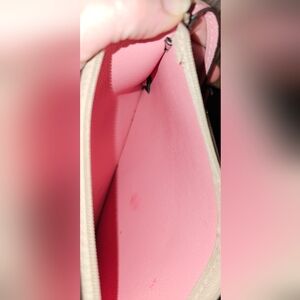 Top Zip pouch made from leather. Light beige/pink with floral pattern. Gold tone hardware with pink wrist strap.