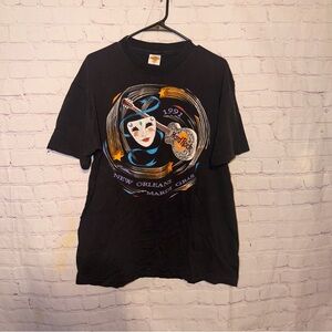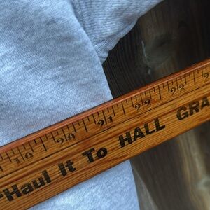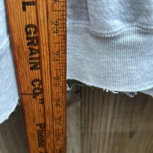 Has some stains and lots of distressing around neck and cuffs. I like the worn in look of this sweatshirt if only it was my size. It’d be in my personal.