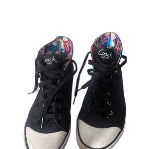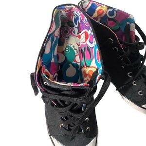 Stylish high-top sneakers. Black canvas with white accents. Signature Coach design.