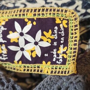 Pretty geometric and crocheted dress with a crocheted crossback in great pre-owned condition by Free People. Size 2 with pleats-pintucks-front and back on the bodice. The hemline is ruffled. There's 8 metal buttons at the bodice. No lining. Invisible side zipper. In terrific condition, never worn.