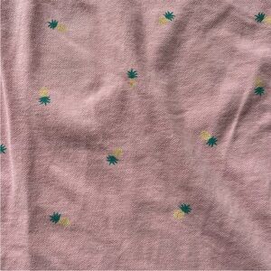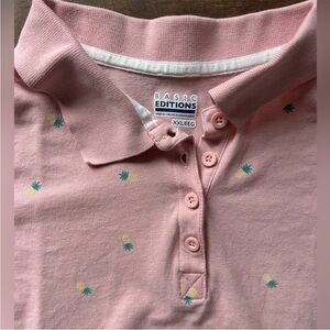 Charming pink polo blouse. Features subtle pineapple pattern. Short sleeves and button-up collar.