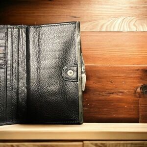 This is a real workhorse of a wallet! The front has a magnetic snap closure with silver hardware buckle that opens to a second snap closure on the left side with 5 card slots, an ID slot, and 3 full-length slots (for bills, etc). The right side has 6 card slots and 2 full-length slots. The left and right sides are divided by a kiss lock compartment (for coins, etc) lined in signature Brighton fabric. The back of the wallet has 1 full-length slot also lined in Brighton fabric. The leather is quilted with brown stitching and is a very slightly pebbled texture with beautiful shine. Measurements are approximately 7” wide x 3-3/4” tall and 1” thick.