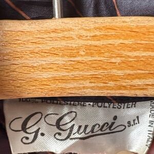 Gucci 80s vintage raincoat. Features a black and brown pattern. Belted waist for a tailored fit. Perfect for stylish outings. Folds into a pouch.