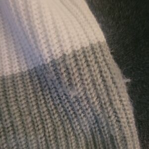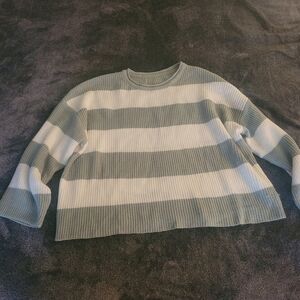 Cozy sweater with green and white stripes. Perfect for casual wear. In good used condition, smoke free and pet free home, no rips or stains, tag cut out