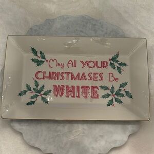 Lenox Holiday Rectangular Platter. The specific platter is part of the "Holiday" or "Winter Greetings" collection and features the text "May All Your Christmases Be White".