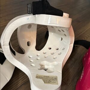 Complete protective sparring martial arts gear set in pink and white. Includes gloves, foot protectors, shin guards and headgear. From non-smoking home. Velcro in good shape, no funky smells