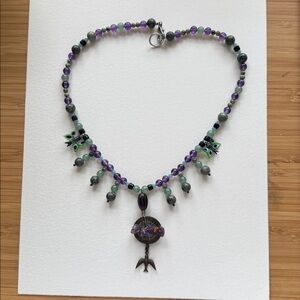 Elegant necklace featuring purple and green beads with a unique bird charm and glass butterflies. Perfect for adding a touch of color to any outfit.