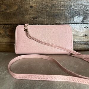 Chic pink wristlet featuring a gold emblem. Ideal for stylish outings