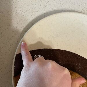 Stylish ceramic plate with a retro multicolor design. Features yellow, orange, brown, and white stripes.