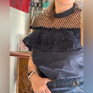 Elegant navy blouse with lace detailing. Features a high neckline and ruffled sleeves.