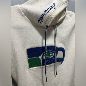 Cream hoodie featuring a Seahawk logo on the front. Comfortable and stylish.
