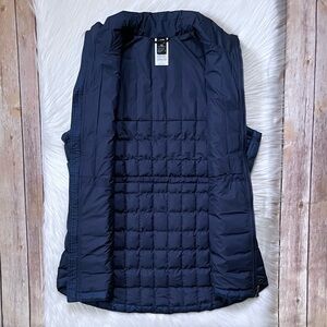 New With Tags- The North Face Women’s ThermoBall Insulated Vest In Summit Navy With Front Zip Closure, Zippered Hand Pockets, Hidden Interior Waist Cinch Cord And DWR Water Repellent Finish.