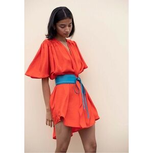 Color is a light stone gray / greige. Fabric content label has been cut but it should be majority lyocell with viscose lining based on online info.