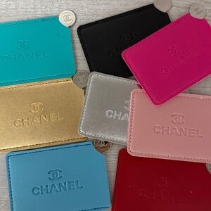 Elegant card holders with mirrors in silver, light pink and blue. 🩶 💙💗 Features iconic logo.