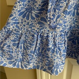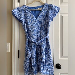 Charming blue dress with white floral pattern. Features a flattering V-neck and short sleeves. Includes a waist tie for a tailored fit. I lost weight and this is too large. Pet and smoke free home.