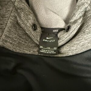 Nike Dri-FIT jacket with a sleek black body. Features a textured gray collar. Comfortable and stylish design.