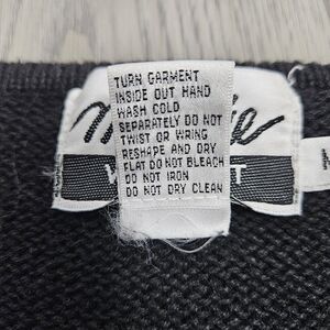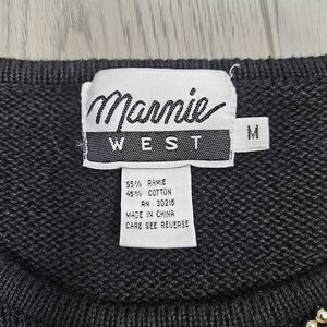 Add some vintage flair to your wardrobe with this colorful and festive Marnie West sweater. The black knit design is adorned with beaded and sequin accents, making it the perfect choice for a holiday or retro-themed outfit. The crew neck and long sleeves provide comfort and warmth, while the shoulder pads add a touch of structure and style. This sweater is a women's size medium and is made from a blend of ramie and cotton materials, ensuring a comfortable and durable fit. Perfect for any vintage lover, this sweater is a timeless addition to any wardrobe.
