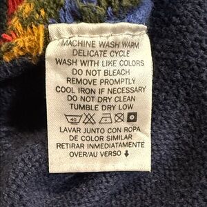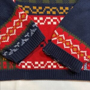 Features an iconic multicolor patchwork Fair Isle knit design with navy sleeves, ribbed trim, and a slightly boxy vintage fit. Super cozy, thick 100% cotton — perfect for winter, holidays, or ski-lodge vibes.