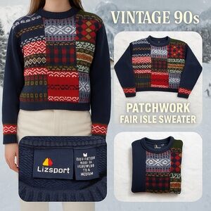 LizSport was a Liz Claiborne sub-brand that was super popular in the late 80s through early/mid 90s, and this exact multicolor patchwork Fair Isle style is peak 90s LizSport.