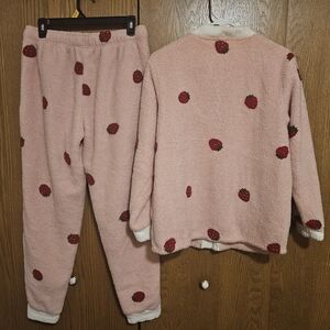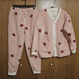 Cozy pink lounge set with strawberry patterns. Includes a cardigan and pants. Sherpa very heavy grandma core pajama set.