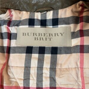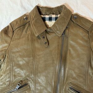 Chic milk chocolate colored leather motorcycle jacket by Burberry. Buttery soft and super comfortable. Features zippered pockets and classic design. Insets at shoulders have stretch to make arm movements more comfortable. There is not a size tag but feels like a medium. Please check measurements in pictures. Excellent used condition.