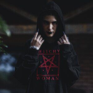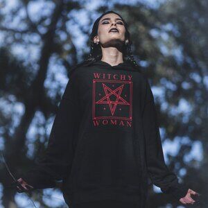 The Witchy Woman Hoodie features a striking red occult sigil framed in geometric lines, with subtle “666” accents and clean typography. It’s bold without being loud, mysterious without being messy, and powerful without apology. Perfect for anyone who loves witchcraft aesthetics, dark symbolism, or simply embracing their inner chaos goddess.