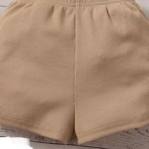 Beige and off white baby girl matching short set with a little ruffle on the shirt
