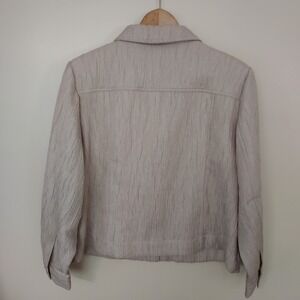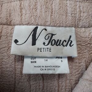 The N Touch Crinkle Button Down Jacket Shaket in Petite size 14 is a stylish and versatile jacket perfect for the woman looking for a short, long sleeve option with a button closure. Made of lightweight polyester, this tan jacket features a collared neckline and a basic jacket style. Ideal for the seasons of winter, fall, and spring, this shaket from N Touch is sure to add a touch of sophistication to any outfit. Side slash pockets