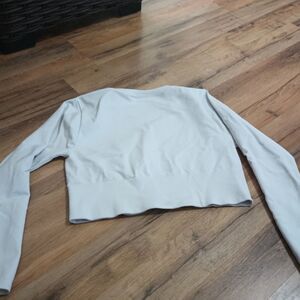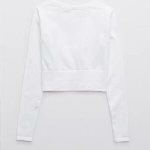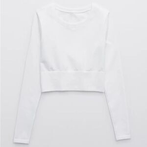 OFFLINE By Aerie White Sidewalk Seamless Long Sleeve Cropped T-Shirt Color: White Size: Large The Details • THE LOOK: Smooth & sleek with a little support. Long sleeve. • THE FEEL: Soft to the touch. Wide bottom band for support. • THE MOVES: Morning runs and running errands. • Accessibility deets: seamless tagless label to minimize irritation & maximize comfort! •Style: 2162-2510 | Color: 100 Materials & Care: • 93% Nylon, 7% Elastane • Machine wash • Imported Size & Fit • THE FIT: Fitted. Cropped. •See last photo for measurement details. **Pre-owned. Not as bright of white anymore (could be bleached however). Other than that this top is in good pre-owned condition.**