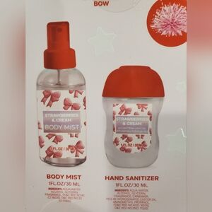 Indulge in the delightful Strawberry & Cream set featuring a body mist, hand cream, and hand sanitizer. Perfect for a refreshing and sweet scent experience.