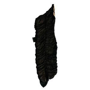 Elegant black one-shoulder dress with ruched detailing. Perfect for evening events.