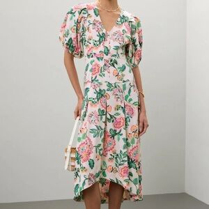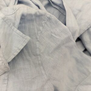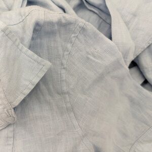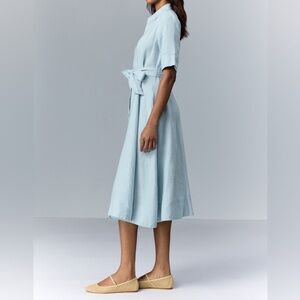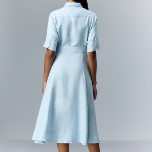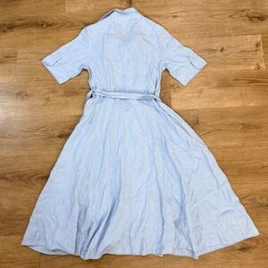 Blue (100% Linen). Casual Dress. Collared. Short Sleeve. Front button down. Since waist.