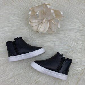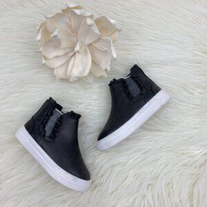 Black sneaker booties with adorable ruffle and shimmery elastic detail. New with tags. These comfy toddler booties feature a side zipper for easy on/off. Non-marking rubber soles.